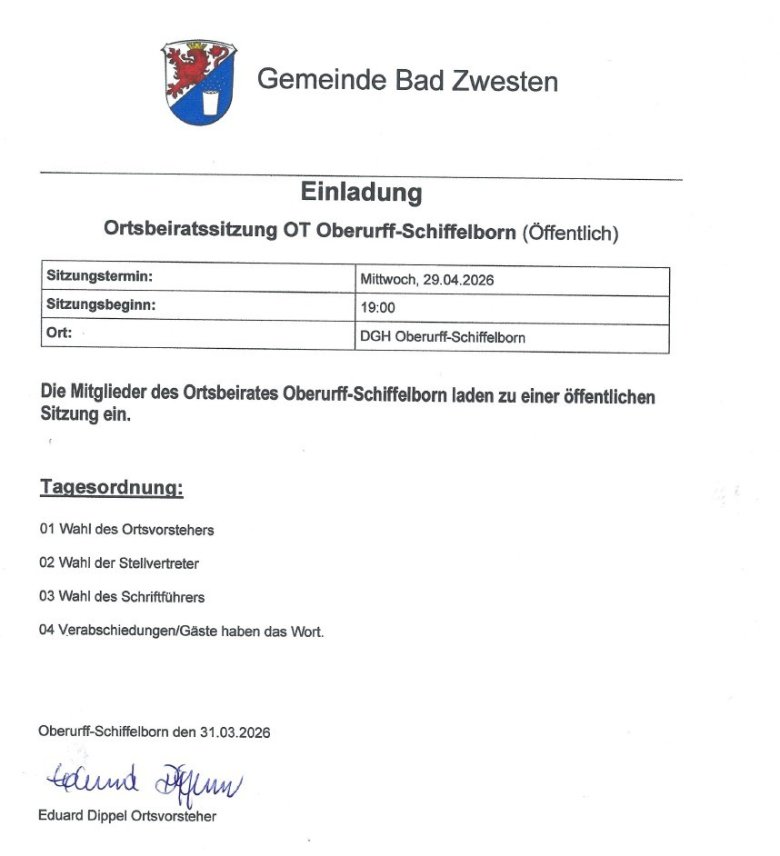 Einladung Ortsbeirats Sitzung Oberurff-Schiffelborn