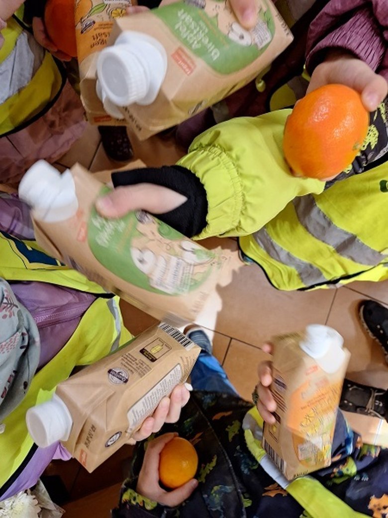 Als Dankeschön erhielten die Kinder Mandarinen, Saft und liebevoll gepackte Geschenktüten für unsere Gruppen. Darüber haben sich alle sehr gefreut.