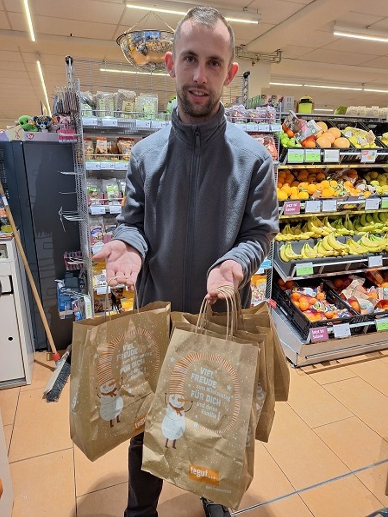 Die Kindergartenkinder der „Wühlmäuse“ durften zu Beginn der Weihnachtszeit den Baum im „tegut“ schmücken.