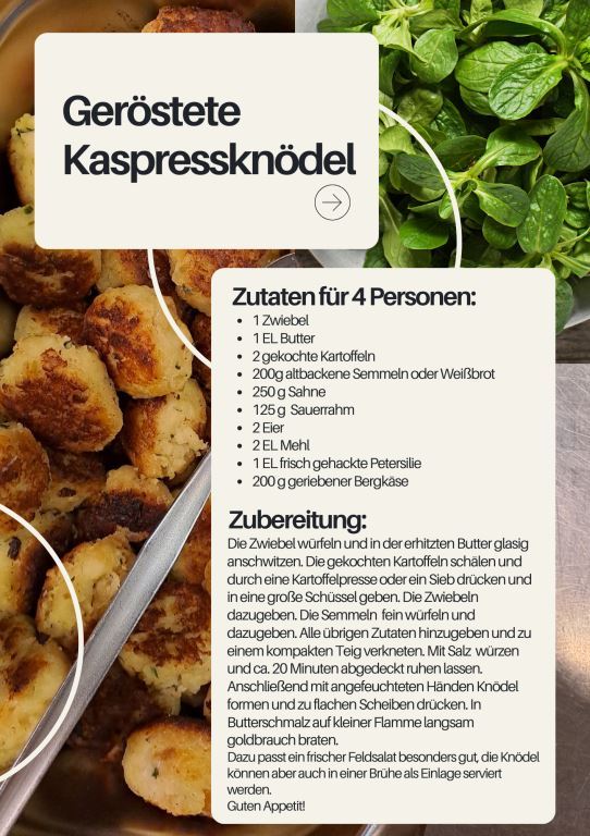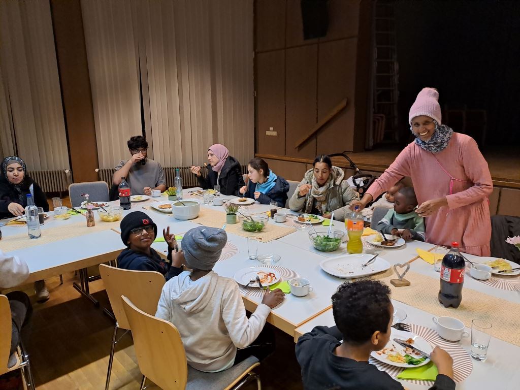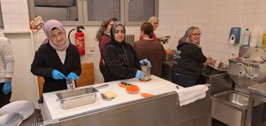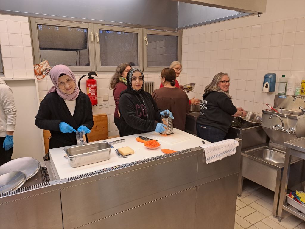 Heike und Martin Siebert, Brigitte Grapentin und Maria Meier haben sich im Vorfeld Gedanken gemacht und ein tolles Menü zusammengestellt. Unser Kochteam entschied sich für Schnitzel (für unsere muslimischen Freunde verzichteten wir hier selbstverständlich auf die Verwendung von Schweinefleisch) mit Kartoffelsalat auf schwäbische Art, marinierten Feld- und Krautsalat sowie eine Quarkspeise mit Zitronenzesten. Brigitte Grapentin, die selbst lange im Allgäu gelebt hat, brachte zudem noch ein Rezept für Kaspressknödel mit, welche in einer schmackhaften Brühe als Vorspeise gereicht wurden. Diese waren auch für viele Einheimische eine kulinarische Überraschung. Das Rezept finden Sie anbei. Viel Spaß beim Nachkochen.
