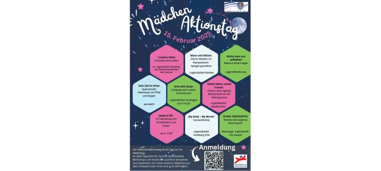 Der Mädchenaktionstag findet am 15. Februar 2025 von 10.00- 16.30 Uhr auf dem Gelände von anorak21 e.V. in Wabern- Falkenberg statt. Im Teilnahmebetrag von 10,00€ sind Materialien und Verpflegung enthalten. Anmelden können sich interessierte Mädchen ab der 5. Klasse über die Internetseite des Schwalm-Eder-Kreises.
