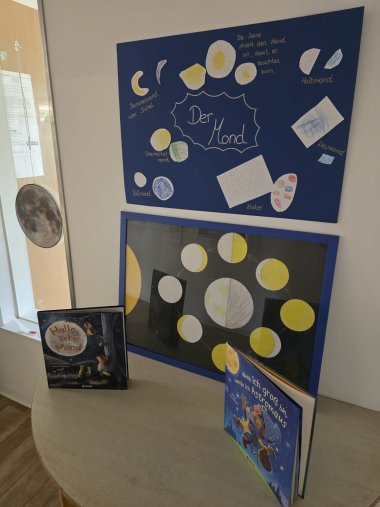 Diese Fragen konnten mit Bilderbüchern, Fachbüchern, Liedern sowie dem Teleskop genauer unter die Lupe genommen werden. In Rollenspielen vertieften die Kinder ihr neu erforschtes Wissen und besuchten in ihrer Phantasie als Astronaut den Weltraum. Raketen flogen auf den Mars, Außerirdische wurden gezeichnet, Planeten gebastelt und ein gesamter Weltraum mit genauem Abstand von Planet zu Planet, gestaltet.