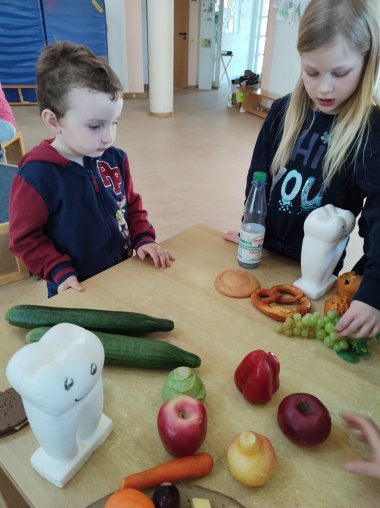 Das medizinische Personal der Zahnartzpraxis Dr. med. dent. Ferhat Derman, Patenzahnarzt des Kindergartens Die Wühlmäuse, besuchte ebenso die Kinder. Spielerisch konnten sich die Kinder, wie beim Zahnarzt in den Mund sehen und sie ordneten zu, welche Lebensmittel die Zähne sauber halten.